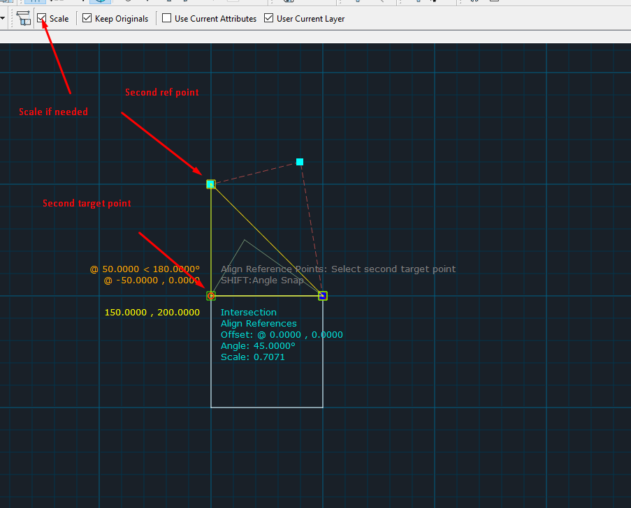 3) Specify second reference point and second target point. First point will be vertex of the triangle, while reference point will be one of vertexes of square.